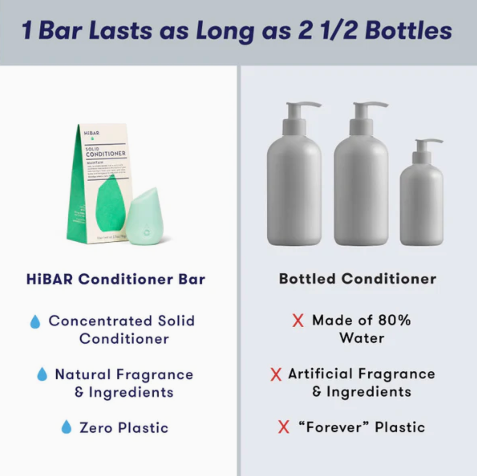 The unique shape of HiBAR Conditioner Bars is designed to fit comfortably in your hand for easy use. And don’t be fooled by the compact size—each conditioner bar lasts as long as 2 1/2 big plastic bottles of liquid conditioner.